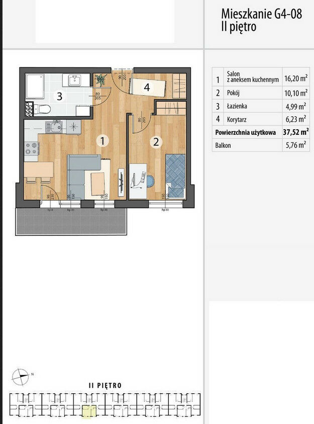 Prezentowane mieszkanie ma powierzchnię 37,52m2 i znajduje się na drugim piętrze w czterokondygnacyjm budynku a jego główne cechy to- salon z aneksem kuchennym o powierzchni 16,2m2 z wyjściem na duży balkon o powierzchni 5,76m2, sypialnia o powierzchni 10,10m2, łazienka o powierzchni 4,99m2, przedpokój o powierzchni 6,23m2.