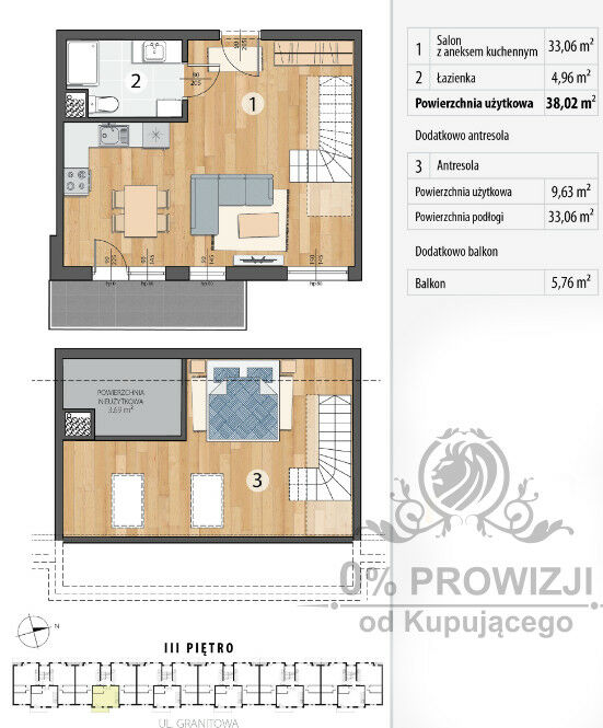 Prezentowane mieszkanie ma powierzchnię 47.65m2 i znajduje się na trzecim piętrze w czterokondygnacyjnym budynku a jego główne cechy to- duży , przestronny salon z aneksem kuchennym o powierzchni 33,06m2 z wyjściem na duży balkon o powierzchni 5,76m2. Na pierwszym poziomie mieszkania istnieje możliwość wydzielenia dodatkowego pokoju, łazienka o powierzchni 4,96m2. Na drugim poziomie mieszkania znajduje się antresola o powierzchni użytkowej 9,36m2 (powierzchnia podłogi 33,06). WAŻNE- opłaty czynszowe w mieszkaniu są naliczane od pierwszego poziomu mieszkania, powierzchnia antresoli nie wlicza się do opłat czynszowych.